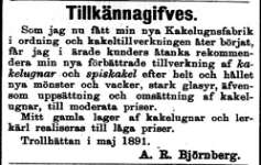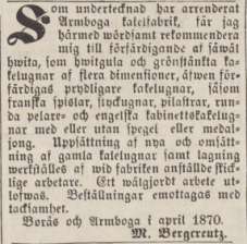 . Vidare i fabriksberättelserna så uppgavs för år 1861 att verkstaden var nedbrunnen, men följande år tycks den ha blivit uppbyggd igen, eftersom det då angavs en tillverkning av stenkärl. Ytterligare ett år senare hade kakelugnar tillkommit bland det som producerades. Antalet var endast omkring sex stycken årligen under de följande åren, men från och med 1866 hade produktionen ökat till sexton stycken och fyra år senare till tjugo kakelugnar per år.