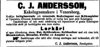 följande: Sex kakelugnar, sex obrända kakelugnar, diverse obrända lerkärl och varjehanda redskap. Andersson titulerades inte någon gång som krukmakare eller kakelugnsmakare, och det är osäkert om han var kunnig i yrket. Eventuellt fick han eller någon av sönerna lära sig hantverket av Wahlström och kunde därmed möjligtvis fortsätta med en viss tillverkning efter svärsonens död. Något annat kruk- eller kakelfolk