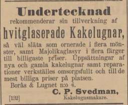 under åren 1847 och 1848. Det förstnämnda året fanns det även två lärlingar vid verkstaden. Därefter har han fått titeln Kakelugnsmakare