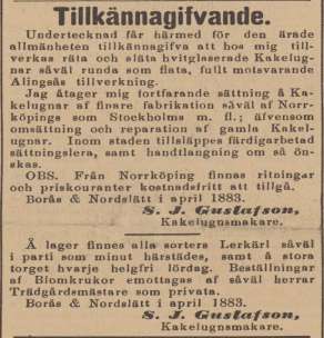 berättas att han 1851 i en skrivelse till sockenmännen i ett antal socknar i Nordals härad ansökte om tillåtelse till att få fara omkring i orten och försälja de af honom förfärdiga kakelugnar och lerkäril