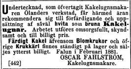 En annons i Fahlu Weckoblad nr 38 från år 1790 berättade om en kommande auktion hos kakelugnsmakare Lundgren: