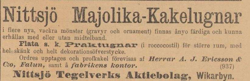 redan från 1873, men det var inte förrän år 1877 som det i olika tidningar gick att läsa angående nya aktiebolag att K. M:t har den 12 Okt. fastställ bolagsordning för Nittsjö tegelbruksaktiebolag, uppå ansökning af hrr M. Nisser, C.J. Hedman och R.A.O. Medén. Bolagets ändamål är att wid Nittsjö tegelwerk inom Rättwiks socken tillwerka tegel, kakel, kruk- och annat lergods. Styrelsen har sitt säte i Falun. …