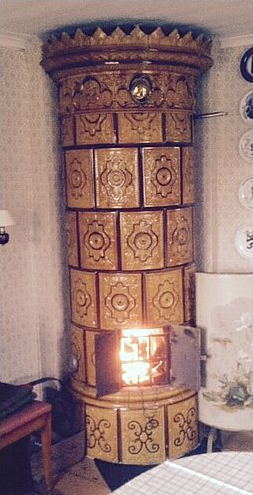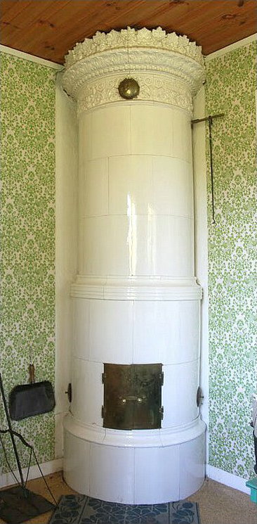T.v. Kakelugn uppsatt i det hus som byggdes upp till Elof och Blända Ljungbergs första hem. Troligtvis är den tillverkad av Bländas far, kakelugnsmakare Jöns Sjöberg. Foto: Ola Rosenqvist