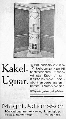 Peter Adolf Magni Johansson föddes den 13/3 1888 i Ljungby, och växte upp tillsammans med föräldrar samt syskon vid Ljungby Södergård nr 59. Troligtvis hade han gått i lära hos någon kakelugnsmakare i trakten när han som kakelugnsmakare bosatte sig och bildade familj vid Ljungby Gästgivaregård år 1920. Enligt en annons från 1926 fanns bostaden då vid Gamla torget och i en medlemsförteckning från 1950-talet i Ljungby Hantverks- och Industriförenings minnesskrift så skall adressen vid denna tid ha varit Kånnavägen 2. Vid Ljungby Gästgivaregård hade även kakelugnsmakare Gustaf Filip Almgren blivit bosatt omkring 1915. Han var född den 6/2 1856 i Nyköping och hade kommit inflyttad till Ljungby Eskilsgård nr 2 från Karlstad år 1910. Almgren fick emellertid ingen lång tid i Ljungby, eftersom han avled den 15/10 1917. Dessa två kakelugnsmakares arbetsuppgifter har troligtvis bestått av kakelugnsuppsättning.