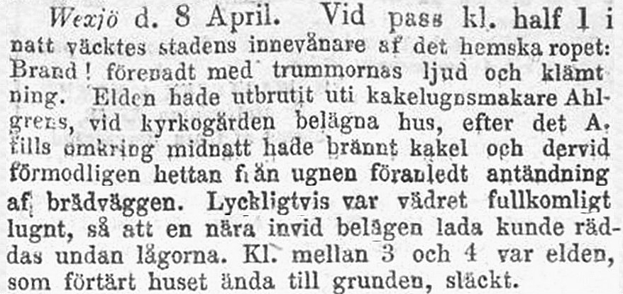 Till Lindholms tidigare verkstad och den tomt som vid denna tid benämndes Herlinsborg nr 7 kom kakelugnsmakare Olof Ahlgren tillsammans med sin hustru år 1848. Han var född den 19/1 1814 i Ronneby men då med namnet Ola Månsson (i husförhörslängderna anges dock andra födelsedatum). Efter lärlingstid hos Werngren i hemstaden arbetade han som gesäll i Kalmar, Karlskrona och Karlshamn innan han 1842 flyttade till Engaholms gods utanför Alvesta. Sex år senare fick han så möjlighet att driva egen verkstad i Växjö. Detta fick dock ett hastigt slut genom den händelse som omtalas i en notis som publicerades i Aftonbladet den 16/4 1853.