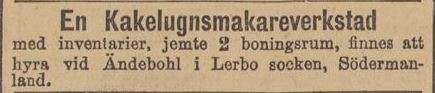 Vidare bland tillgångarna upptogs Diverse kakelugnsmakareverktyg och dertill hörande redskap