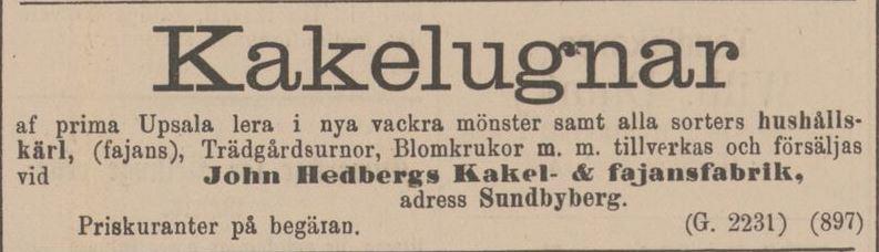 Året efter att Sundbybergs kakelfabrik brunnit ned startade en annan kakelfabrik upp sin verksamhetet i den dåvarande köpingen. Detta genom John August Hedberg, vilken var född den 3 november 1856 i Gävle. Innan han tillsammans med sin hustru år 1889 inflyttade till Sundbyberg hade han under en tid varit verkmästare vid Upsala kakelfabrik (Forsstén, Forssell & Co). Redan i september samma år som han flyttade in till köpingen annonserade J Hedberg efter kakelbrännare till sin nyanlagda kakelfabrik och några månader senare fanns i tidningarna en annons där John Hedbergs Kakelugns- och Fajansfabrik sökte efter en van ugnsinsättare. Under våren 1890 annonserade han flitigt i ett flertal landsortstidningar, mestadels i norra Sverige. Nedanstående annons är hämtad från Hudiksvallsposten den 19 april 1990.