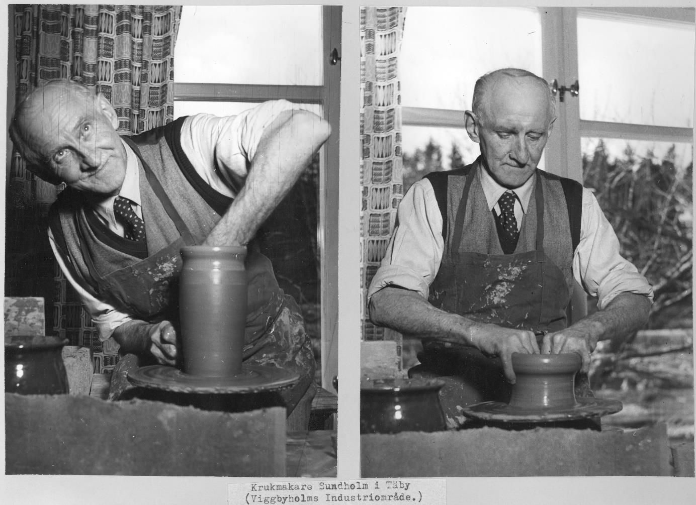 Karl Wilhelm Gunnar Sundholm, föddes den 11 december 1888 i Turinge, Stockholms län, men familjen bosatte sig så småningom i Mariefred, där Gunnar femton år gammal kom i krukmakarlära. Bland annat arbetade han en kort period hos Dorothea Ljungqvist, alltså hon som tillsammans med sin mor, Emma Nyman, drev Sundbybergs lerkärlsfabrik i Solna. När fru Ljungqvist 1909 flyttade till Nyköping för att där överta en krukmakarverkstad följde lärgossen med. Denna verkstad tog Sundholm efter några år över och utvidgade den till en tämligen stor rörelse. Tillsammans med hustru och barn lämnade han dock Nyköping 1951 för att i stället bosätta sig i Viggbyholm, Täby församling. Där startade han och barnen företaget Täby Lervaruindustri AB, med tillverkning av blomkrukor men även av prydnadskeramik. Under 1953 gick denna annons att läsa i Dagens Nyheter: Drejare får plats nu eller senare Täby Lervaruindustri, Viggbyholm.