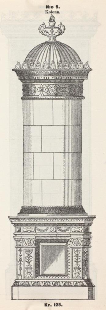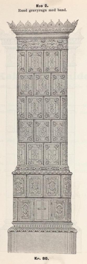 får man förmoda att det kom igång en tillverkning av kakel till kakelugnar hos honom. Prislistan innehöll prisuppgifter på både flata samt runda kakelugnar och det i ett flertal olika storlekar. Dessutom kunde man välja mellan kakel som var brända en gång eller kakel som var brända två gånger. Det sistnämnda något dyrare. Ett exempel från denna prislista: Rund kakelugn med 28 tums diameter: Uti 8 fots höga rum 5 skift. Bränd en gång 18 kronor, bränd två gånger 21 kronor