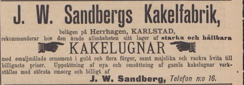 A.P. Sandberg, den gamle kakelugnsmakaren härstädes, der han vistats i öfver 40 år, fick i tisdags sluta sitt fordom så verksamma lif i en ålder af öfver 70 år. Sandberg var den förste som här tillverkade kakelugnar af väl känd godhet. För c:a 18 år sedan öfverlämnade han fabriken, först åt sin måg fabrikanten Rud. Sjöberg, och sedan till dess nuvarande innehafvare. Sin ålders höst tillbragte Sandberg i lugn och frid, frisk och rask för sina år, tills åren slutligen togo ut sin rätt och han fick afgå från det jordiska , sörjd och saknad af efterlefvande åldrig maka, en gift dotter samt flere vänner bland de äldre hantverkarne.