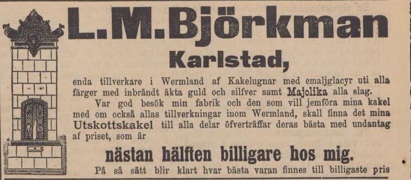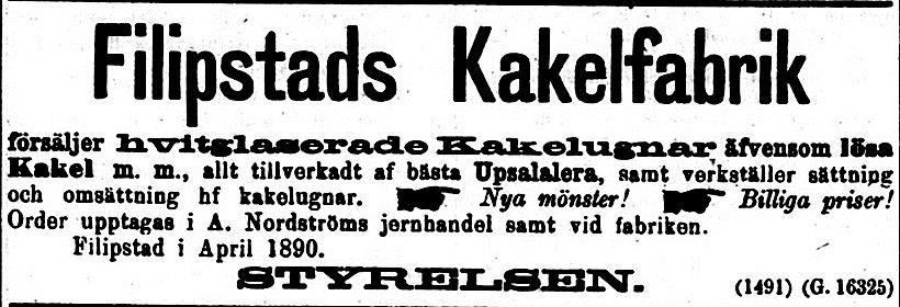 Kakelugnsfabrik till salu. Af en händelse finnes uti Kristinehamn en kakelugnsfabrik till salu, med fulla inventarier och den enda i sitt slag på platsen; till fabriken hörer några tunland jord, der god lera finnes. Platsen passar äfven för annan fabriks anläggning, emedan den är belägen vid en förbiflytande elf. Uppgörelse om denna egendom träffas med undertecknad.
