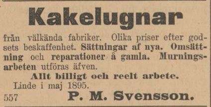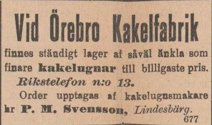 Naturligtvis har det i Lindesberg även funnits kakelugnsmakare som enbart sysslade med uppsättning och reparationer av kakelugnar samt plattsättning. En av dessa var Peter Magnus Svensson, som blev född den 10 maj 1895 i Åkers socken, Jönköpings län. Till Lindesberg kom han 1876 efter en tid som snickare vid Laxå valsverk.