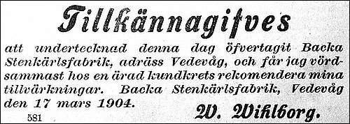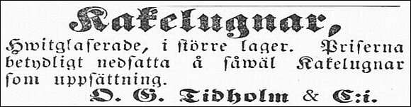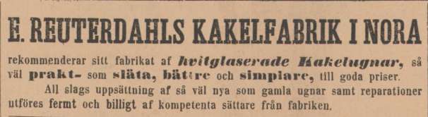 TILLKÄNNAGIFVES att undertecknad öfvertagit KAKELUGNSFABRIKEN härstädes, och får jag ödmjukt rekommendera mig i respektive kunders hågkomst. Jag skall söka att i allo uppfylla mina blifvande kunders fordringar. För sådant ändamål har jag försett mig med praktiska och kompetenta sättare och formare m.m. Då härtill kommer, att materialier af bästa qvalitet användas, är jag i tillfälle att åstadkomma ett smakfullt och elegant fabrikat, billiga och bestämda priser samt skyndsam expedition. E. REUTERDAHL.