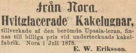 En i gång varande Kakelfabrik med boningslägenheter, bestående af 3 rum och kök samt nödiga uthus, är till salu eller arrende. Fastigheten brandförsäkrad i allmänna brandförsäkringsverket för 6,800 kr. Förmånliga vilkor om snar uppgörelse sker med C. A. Mothander eller L. F. Holmqvist, Nora.