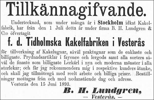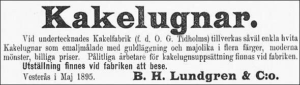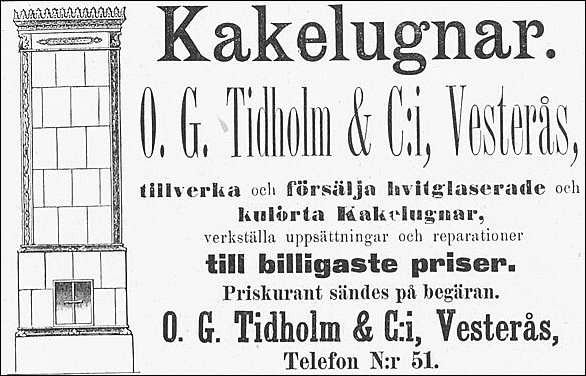 I Westmanlands Läns Tidning gick det 1853 läsa att kakelugnsmakare O G Tidholm ansökt hos Magistraten (ungefärligen stadsfullmäktige) om tillstånd att på stadens mark invid Lillån få uppföra en mindre byggnad med vattenhjul för drift av en krosskvarn, vid vilken glasyrer till hans kakelugnsfabriker skulle bearbetas. Av vad som framgår av artikeln skall Tidholm i varje fall vid detta tillfälle inte fått bifall på sin ansökan. O G Tidholm, och senare firman O G Tidholm & C.o, skulle komma att annonsera flitigt i olika tidningar. Men redan 1843 fanns denna annons införd i Westmanlands Läns Tidning:Lager af Kakelugnar af 3.ne sorters hwit glasyr, Stenkäril, hwaribland Krus efter utländsk modell, tjenliga att hålla watten friskt, allt till facila priser hos O.G. Tidholm i Westerås.