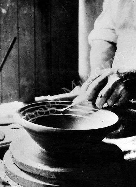 : Diverse verktyger för krukmakeri, obrända stenkärl och kakel.