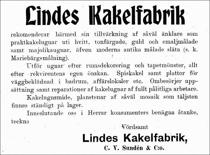 Den 20 juni 1903 återfanns i samma tidning så följande notis: Lindes kakelfabrik, hvars uppbyggande bedrifvits med stor energi, är nu i det aldra närmaste färdig och torde första bränningen här kunna börja i medio af nästa vecka. Modellering m.m. pågår dagligen. Tillvärkningen kommet till en början att omfatta c:a 600 kakelugnar per år.